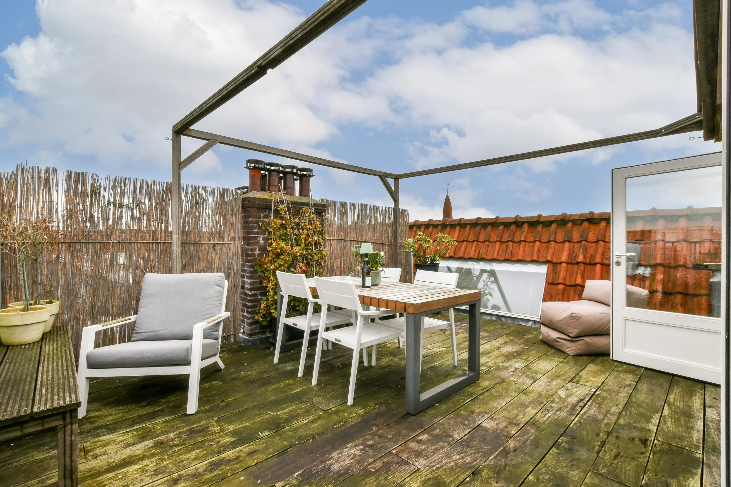 Bau einer Pergola und Anfertigung von Sitzbänken aus Holz in der Zweitverwertung, sowie das Verlegen von Dachterrassenböden